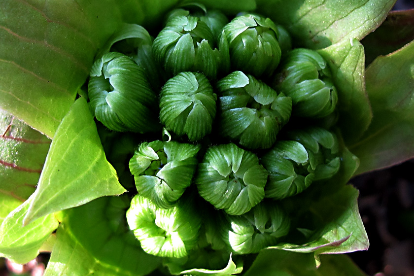 玄関脇においてある金のなる木の鉢植え北風が当たりにくいので年末には小さな花芽がつく。年が明けると,花芽は成長を続けて2月になると花が開く。今日3個の開花を確認した。