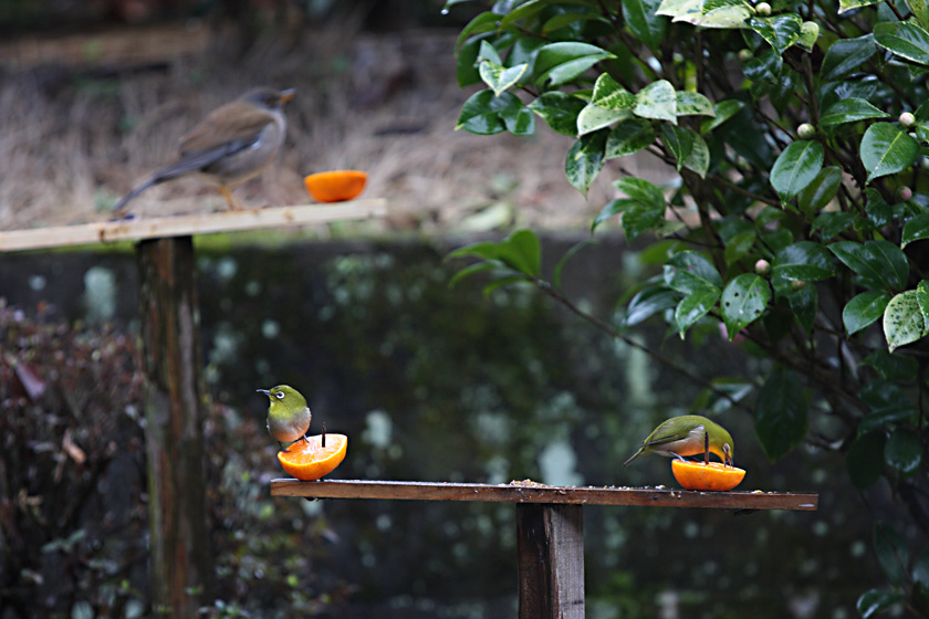 雨が上がって食事にやってきました。メジロとシロハラ,近くのテーブルについています。