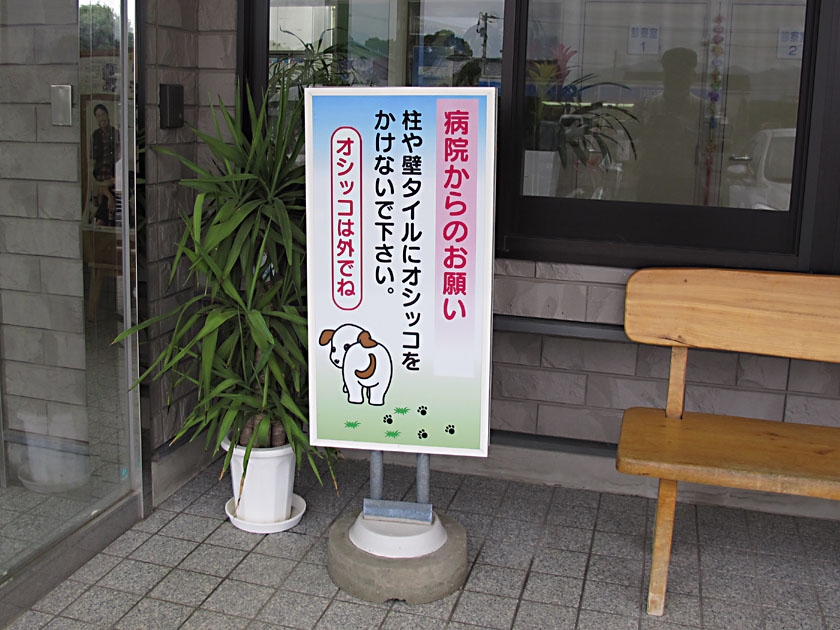 ワンやニャンに言っても無駄,飼い主に言わなきゃ。それとも,酔っ払いへの警告立札かな?犬猫病院では,なぜペットに対して「この子は・・・」と言うのだろう?どうも気持ち悪い。
