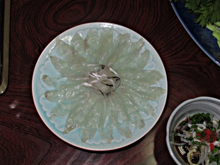 今日の夕食は,高級ふぐ料理のフルコース(?)だった。席に着いたときに準備してあったのは,ふぐ刺しと,皮のニコゴリ。ビールを飲みながら次の料理を待っていると,出されたものは白子がたっぷり入った茶わん蒸し。♪んだもこら いけなもんな ♪まこて んめごわした。ふぐといえばやはり鉄チリですね。ただ骨が付いたお魚さんは苦手でして,このなべ料理だけは野菜をメインにいただきました。温めてほしいと待っている野菜たち。〆は,ふぐ雑炊。お魚をほとんど食べない小生でさえ十分に食べられたふぐ料理の数々でした。