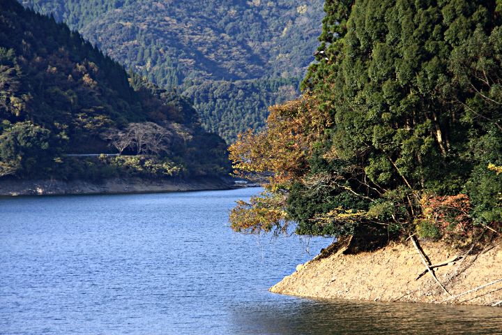 小春日和の中,紅葉を見にダム湖の周囲をさまよったがたいしたことはなかった。山の淋しい湖にひとり来たのも悲しい心胸の痛みに耐えかねて昨日の夢と焚き捨てる古い手紙のうすけむり
