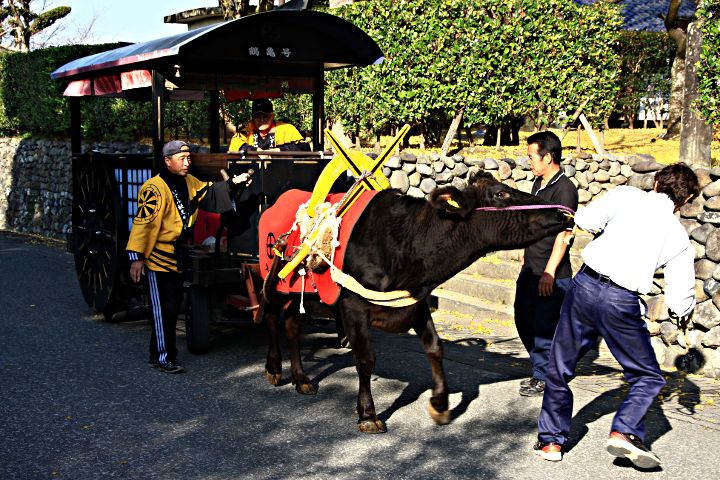 鶴観光と歴史的伝統建造物群の見学併せて動いている牛車,牛たちの牽引訓練が行われています。このコースは約一kmですが,牛さんたちはきつくなるとストライキを起こして立ち往生します。こうなる人間たちも「往生しまっせ。」