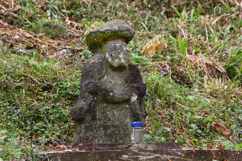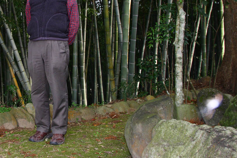 麓まつりは,こちらの地頭であった山田昌巌(やまだしょうがん)の遺徳を偲ぶために始められた祭りだが,地元の人間でさえその墓の在処を知らない。見晴らしがいい山城の跡にあるので,蚊やニョロが出て来ない春秋は木陰もあるし静かに憩える場所だ。昨日,祭り以来二回目の墓参り(?)に行ってきた。三脚を持って行かなかったので,コンクリートのテーブルにカメラを据えて,距離を目測しセルフタイマーで記念撮影。画像は顔の部分はトリミングしてあるが,右下の石のところになにやら妖しい光が映り込んでいた。よく見ると6角形だからレンズのゴーストが出ていた。レンズのゴーストにしては形が崩れているようでもあるな。しかし,そのうしろ赤丸で囲んだ部分に人の顔のようなものが写っていた。どうも幽霊さんと一緒に記念撮影をしたようだ。この画像は元のサイズのまま。
