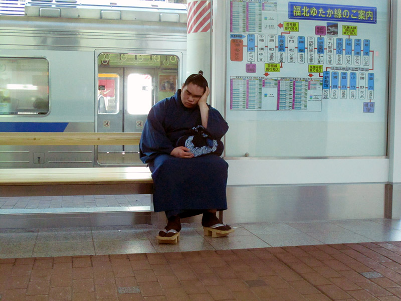 取り組みがない日だったのでしょうか。多分練習疲れでしょうね。朝一〇時過ぎ,博多駅8番ホームにて。昼過ぎの列車の中はぽかぽかで心地いいです。早起きのおじいちゃんは眠くなったのでしょう。お昼一二時過ぎ,後藤寺線で。