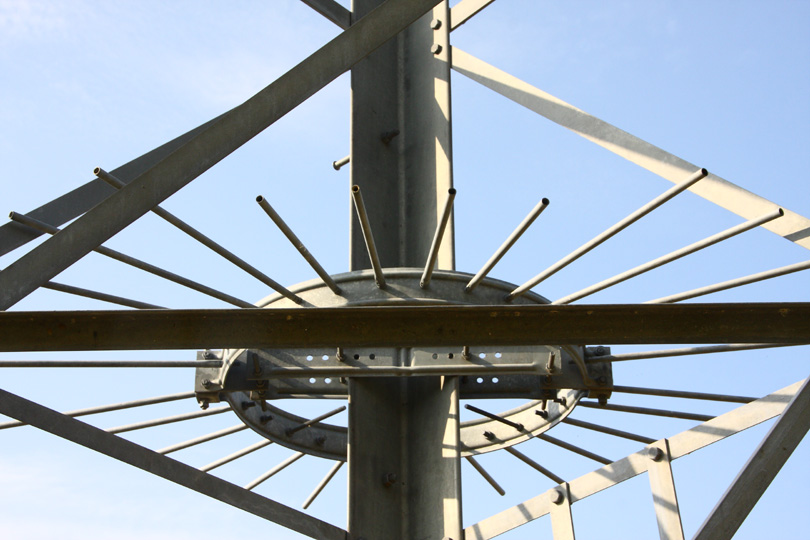 しげしげと眺めたことがない送電線の鉄塔。高さ3m位のところについているこのパーツ何をするためのものだろう。春日三球さんだったら眠れなくなるかも。