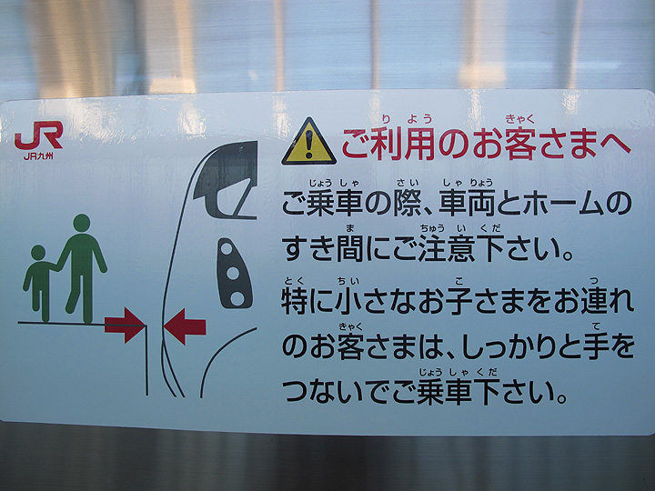 この大きな注意書きのポスターは,九州新幹線ホームの安全扉に貼ってあった。安全扉だから列車がホームに入ると客の乗降のために引っ込んで見えなくなってしまう。ってことは,扉近くに並んでいる人はこれを目にすることが出来るが,後に並んでいる人は扉が開いてしまっているわけだから読めないことになる。動いて隠れてしまう安全扉に貼れば注意書きとして用はなさないので,ポスターの存在自体意味がないと思うひねくれ者は私だけかな?貼る場所を考えてほしいな。それにしてもすべての漢字にルビを振るとは,誰に読ませるための文章なんだろう。漫画ばかり見ているから漢字が読めなくなったのかな?