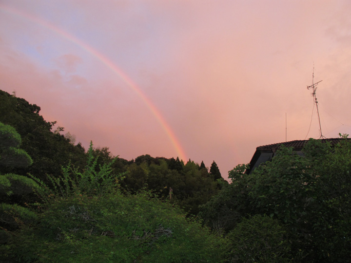 毎日夕方5時過ぎには食べ始める夕食が,今日はかなり遅くなって7時前からの夕食になってしまった。食べながら外を眺めると,♪夕焼け空が真っ赤っか, トンビがくるりと輪を描いた♪ 状態で世間も真っ赤になっていた。急いで夕食を終え,デジカメのWBを太陽光にセットして外に出た。ふと空を見上げると,7時半にもかかわらずニジが出ていた。カメラを空に向けた途端,家の中で電話の呼び出し音が鳴り響いた。『っきしょう,シャッターを切らなければならないのに,ブツブツブツ・・・・』電話を取ると,「先生,今,空に虹が出ているよ。」とお知らせ電話だった。久しぶりに虹を見ることができました。