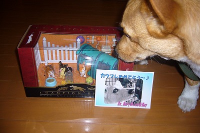 キョロキョロ コソコソ・・・・バタバタ ドドドドドドー ドテ ポテチン ポリポリボォン ジョルノ~ ニーハオ~ アンニョン ハシムニカ~ こにゃにゃちわ~腰痛で ダウンして更新出来ず やっと 復活してまいりました~~~ どーも どーも何かと体を動かす用事が多く 腰が悲鳴を上げまして・・・と 言い訳なんかしちゃってさ~ さて ご報告が遅くなりましたがが 先日 mary0611さんから カウプレが届きましたいや~~~初めてHITしちゃって そりゃーも 町中大騒ぎさ~ ホンマか??この日は9時に就寝し 本来なら朝までコースなのに なぜか夜中の3時に目が覚め夢遊病のように PC前に座り ポチ!ってしたら パンパカパーン 大当たり~これは まさしく ジャジャジャーンですな~~~ はい!運命です前置きが長く あくびを し出してる方がいそうなので ここらで プレゼント見せちゃいます どうよ!どうよ! コギちゃんだらけ~~~ うほうほだぜ~~ベーベー私も ついに 念願の多頭飼い?? プププレオ君とメイちゃんの 写真も 素敵だし~~早速 出窓に飾ってみました キャッキャ かばええ~~~~~~~~~~~(窓ガラスに反射してる 怪しい影は 私です・・・ お化けじゃないよー)このセットでは~い おやつですよ~~ とか お水飲んでね~ なんて 1人遊びしてる私って怪しい??? ンプププmary0661さん 本当に どうもありがとうございました大切に 大切に 使わせて・・・飾らせてもらいますねこれからも 宜しく願いしますねシュガーからも 1言 そうそう 今日旦那に HDDタイプのビデオカメラ発注してもらうように頼んだんだ~ワーイ ワーイ 早く届かないかな~~じゃないと 今週末は運動会だし 取説読んで (いつも 読まないけど)しっかり マスターしとかないとね~ もっと 早く買えばいいのに 何でも ギリギリなのさ・・・死んでも直らない この性格・・・では では またね~