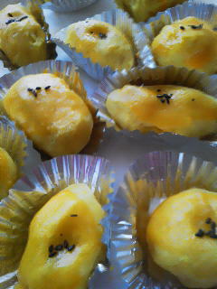 さつまいもをやわらかくなるまで茹でて、バター、グラニュー糖、牛乳、塩をいれて混ぜつぶす。形をつくり卵黄を塗り、黒ごまをのせてオーブンで焼きました。
