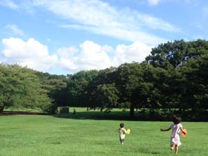 答え:砧公園。世田谷区内にも、こんなところがあるんですよ~。(^-^)昨日、久しぶりに行ったら、子供たちが気に入ってしまって、二日連続で今日も行ってきました。(ちなみに写真はウチの子供たち)世田谷育ちの私は、小中学生の頃、写生大会?などのイベントで、よくここに行ってました。当時は「砧ファミリーパーク」と呼ばれていました。元々、ゴルフ場だったところだそうで、ウチの母の時代には、「緑地帯」と呼ばれていたそうです。(なので、母は未だに緑地帯、緑地帯と呼んでいます。(^^;)大学を卒業するかしないか位の頃に世田谷美術館が出来て、デートスポットとしても一躍注目を浴びましたね~。私がデートで利用することはついぞありませんでしたが。子供が生まれてからは、行ってもせいぜい一番手前にあるアスレチック広場までだったんですが、子供たちも大きくなってそこそこの距離でも連れ回せるようになったので、今回久しぶりに奥の方まで行ってみました。そこで初めて、世田谷美術館から先の芝生のゾーンが「ファミリーパーク」と呼ばれるエリアなのだと知りました。(これって、昔から?)春は桜の名所だとのことで、すばらしく巨大な桜の木々がありますが、その代償か?、毛虫の多さには参ります。木の陰に隠れる歩道の部分には、無数のつぶれた毛虫の死骸が散在していました。公園の中には小さな川が流れていて、吊橋もあります。サイクリングロードも整備されていて、以前は自転車の貸し出しもしていましたが、今はなくなってしまったようです。いずれにしても、環八を行き交うクルマの音さえ気にならなければ、23区内とは思えないような自然を満喫できる、世田谷屈指の癒しスポットですね。私もたっぷりオゾンを吸って、リフレッシュしてきました。疲れましたけどね。(^^;
