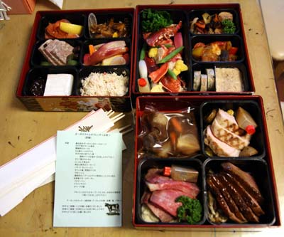 駒沢にあるフレンチレストラン「オーボナクイユ」の特製おせちです。(私、これまでのエントリーで、間違ってオーボクナイユと書いてました。)以前Buska-sanさんがこのお店のことを書かれていたのを読んで、お店のサイトにアクセスしたら、たまたま限定30食のこのおせちのことが載っていたので、お店には伺ったこともないのに、あつかましくも頼んでみたものです。今日お店に伺って引き取ってきましたが、なかなか立派なお重と包みに入ってましたよ。こちらがお品書き。正月はこれをつまみにワイン三昧‥といきたいところですが、元旦、二日とそれぞれの実家を訪問するのが我が家のならわしですので、あまりゆっくり味わっているヒマはないんですよね。ということで、さっそく今晩からいただいてしまおうかと思案中です。
