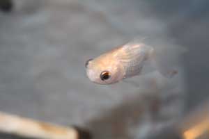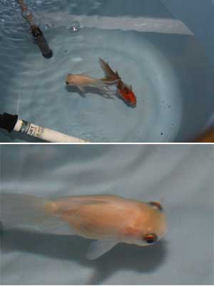 治療が手詰まりとなってしまった白オランダとキャリコ琉金。その後はココア玉をエサ代わりにやっていましたが、よく観察してみると、キャリコが白オランダを突きまわしています。突かれるたび、宙に舞う枯葉のようにユラユラとしているオランダを見て、これはかなり弱ってきているなと判断。キャリコはいったん元の水槽に戻して、白オランダのみ薬浴を再開しました。ところが、時すでに遅しだったのでしょうか、あれよあれよという間に、翌日には写真のように虫の息になってしまい、昨晩帰宅したときには水面に浮いて、かろうじてエラを動かすだけになっていました。今朝はまだ水槽を確認していませんが、まず間違いなく☆になっているのでしょう。出社の前に埋めてやろうと思います。家に来て9ヶ月。1年飼ってやることすらできませんでした。飼い主として未熟です。水槽に戻したキャリコは長期のダイエットのおかげか、とりあえず快調のようです。もっともこちらもまたすぐに浮きだすのでしょうけどねぇ。