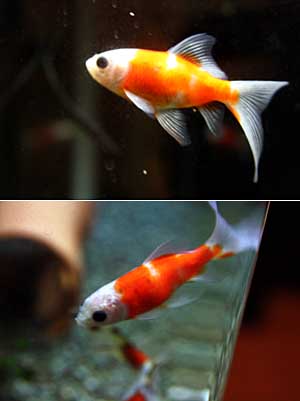 松かさ病の白オランダを失ったものの、それ以外の金魚たちについてはこのまま年越しできるかなと思っていたのですが、今度は玄関の和金水槽です。サクラコメットの様子が変なのです。下の写真を見てください。<写真上>右側面にポツポツと白い出来物(白点病ではない)が出来ており、そこから綿状のものが出たりしています。出来物はポツンと盛り上がっている様子です。<写真下>そして、またコレです。この1週間で急に左側の腹が盛り上がってきて、上からみると、五角形を逆にしたような体型になってしまいました。まず間違いなく「腎肥大」でしょう。当歳魚のみがかかるというこの病気、腎臓に寄生する腺虫が原因らしいのですが、この水槽に新しい個体を入れると、3~6ヶ月のうちに必ずこの病気を発症します。当歳魚ばかりこれで5匹目。そして、この病気を治す術を私は知りません。鬱です‥。