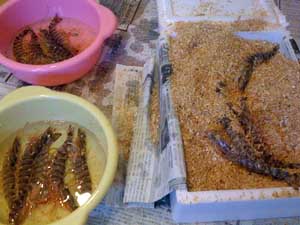 さて。バケツに隔離中の2匹。転覆のキャリコと松かさの白オランダです。キャリコで2週間、白オランダに至っては(断続的にではありますが)かれこれ3週間になろうとしています。ココア浴のあと、新たにエサやりをしていないことから、ここ2日ぐらいはほとんどフンもしていません。以前は、ここまでくれば白オランダの松かさ症状は収まったものですが、今回はまだウロコが若干立ったままです。キャリコもエサやりを再開すれば、きっと2日ぐらいでまた逆戻りでしょう。今はとりあえず、薄めの薬浴だけしていますが、なにをやっても決定打に欠ける以上、長い時間をかけて体質改善させるしかないんですかねぇ。水槽3つに加えてバケツまで世話をしなければならないのは、この季節、かなりシンドイのですが‥。