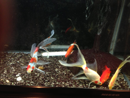 最近めっきり金魚や熱帯魚ネタが少なくなってしまいました。正直、以前ほどの熱い?思い入れがないこともありますが、とりあえずこれといった大きな変化もないので記事にしにくいのです。水槽が居間に置かれていた前の家と違って、今の家では水槽はすべて階下の玄関脇にあります。そのため、日常的に鑑賞できるわけでないこと(特に冬場は寒いので外出時以外足が向かない)、餌を一日一回に留めているので、成長のペースが遅いことなども今ひとつモチベーションが上がらない理由だったりします。玄関の60センチ金魚水槽は目下5匹。朱文金×1、コメット×2、和金×2。和金は3年前の金魚掬いで採ってきたものと、昨年の金魚掬いの新入りとのコンビです。朱文金とコメットはいずれもチャームさんで購入したもの。真っ白のコメットが2010年5月、他の2匹は2011年11月に購入。不用意に新入りを入れたりすると、なぜか必ず先住金魚のどれかが☆になるので、最近は金魚が死んでも補充や入れ替えは最小限にしています。こちらはコケで汚くなってしまっている熱帯魚水槽。これでも水換えは一応二週に一回ペースを守っています。一時グッピーが爆殖していましたが、夏場に次々☆になってしまい、今は30匹ぐらいでしょうか。2世代目のメスたちが子を産んで、3世代目の稚魚もボチボチ大きくなってきました。ただ、全般に購入時に比べて、体型が小ぶりになり、色合いや模様も鮮明でなくなってきています。全般に衰退傾向なのは否めません。一方で我が家の環境が合ったのか、非常に安定しているのがカーディナルテトラたちです。20匹購入したうち、落ちたのはまだ一匹だけです。買った頃(2011年12月)に比べると体型も一回りからふた回り大きくなりました。昨夏に子供が学校からもらってきた3匹のメダカ。それが次々卵を産み、今では60~70匹ぐらいになっています。生育環境を考えると、本当は少し「間引き」をしなければならないんでしょうけどね。可哀想でなかなかできませぬ…。2台の小型水槽に入れて飼っていますが、ヒーターを入れていないので、今の時期はほとんど動かず餌も食べず、冬眠に近いような状態です。来年どうするか、処遇に悩むメダカたちです。