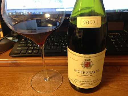 大雪の中をバースデーケーキを引き取りに行った話を前々回書きました。疲れ果てて帰宅して、夕食前から飲み始めたのがこのジャック・カシューのエシェゾーです。もちろん子どものVTの02年。リリース直後にどこかのショップで購入して、寺田に預けていたボトルです。ちなみに2本買ったうち、もう一本は目下行方不明。多分寺田倉庫の別のダンボールに入っていると思うのですが…。キャップシールを剥がすと、なんともゴージャスに噴いています。保存はきちんとしていたはずなので、おそらくこれはコルクの問題でしょう。ジャックカシューのコルクは今までも何度か緩くて噴いてしまったものに遭遇しています。果たしてコルクを抜いてみると、コルク側面は未だにヌルヌルとしていました。かろうじて密閉の役割は果たしてくれていたようですが、このコルクはいただけませんね。香りはその影響かもしれませんが、若干馬小屋系の香りになてしまっています。少し火を通した黒系の果実、焦臭、丁子、黒コショウ、ナツメグなど、素性のよさそうな香りの要素の中に、若干不快なニュアンスがまざっているのが残念でなりません。飲んでみると、やや強めの酸とそれを受け止めるリッチな果実味があり、全般にトーンの高い暖色系の味わい。充実した味わいである反面、やや単調で一本調子な感もあります。以前、ワイン会で飲んだ95年のエシェゾーが、同時に開けた2000年のルソーのクロドベーズを食ってしまうほどすばらしい香味だったことがありました。それ以来、ずっとジャックカシューのエシェゾーを買い続けてきたのですが、その後、「そこそこの」ものはあっても、めくるめくようなものには当たらずじまいです。まあ値段も安いし、そもそもルソーのベーズと比べることに無理があると言われてしまえばそれまでですが。私が過大評価しすぎていたのかもしれません。最近のVTでは、プライスも8kを切るか切らないかぐらいまで落ちてきてますが、結構他の愛好家のみなさんも同じような思いなのかもしれませんね。なお、ボトルの下の方になってくると、厩臭は目立たなくなり、黒系果実中心の心地よい香りになってきました。最後の一杯には澱が随分混じっていましたが、凝縮感も十分ですばらしい味わいでした。やはり噴いたことで、ボトル上面から不自然に酸化が進んだということもあるのかと思います。★★☆