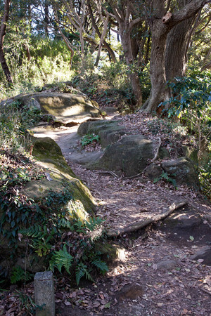 東慶寺を出て、ハイキングコースを進んでいくと、すぐに次の浄智寺に到着します。浄智寺は、禅宗(臨済宗)の寺院の格式を示す制度「五山の制」で、「鎌倉五山」の第四位に列せられている、格式の高いお寺です。鎌倉幕府の五代執権・北条時頼の三男宗政の菩提を弔うために、夫人と息子の師時(もろとき)が創建しました。入り口はレトロなポストが目印です。浄智寺の三門(山門)は、めずらしい中国風のデザイン。三門へと続く、すり減った鎌倉石の石段はとても風情があり、映画『武士の一分』の撮影にも使われました。新之丞(木村拓哉)の妻・加世(檀れい)の墓参りのシーンです。境内奥の、洞穴の中に立っている布袋さまは、「鎌倉・江の島七福神めぐり」の布袋和尚(ほていおしょう)。お腹をさするとご利益があるとされ、皆が触っていくので、お腹のあたりが、黒くなっています。なにゆえ狸が?と思ったら、近くで交通事故で亡くなったらしいタヌキを葬ったものだそうです。http://homepage2.nifty.com/kitakama/yorozu/yoro021.html山寺の雰囲気が色濃く残る風情のある寺ですね。奥の方にある洞窟や布袋様や狸などは、スピリチュアルなムードに満ちていて(行った時間や天候にもよるのかと思いますが)若干不気味でした。浄智寺の脇を抜けると葛原岡・大仏ハイキングコース登山道への入り口となります。