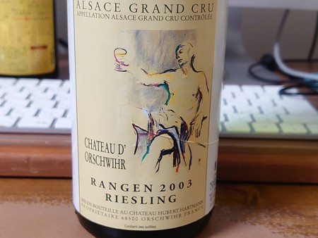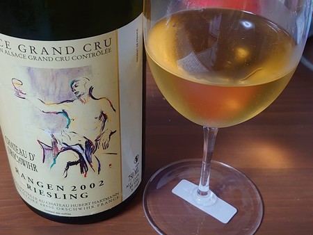 02年、97年と飲んだシャトー・ドルシュヴィールの熟成安リースリング。今度は03年を飲んでみました。03年といえば、フランスでは灼熱のVTと言われた年。ブルゴーニュなどでは焦げたフレーバーや酸の低さが問題になった年でした。今更このビンテージのフランスの白ワインを買うというのはそれなりにリスキーだと思います。私は、下の子のVTだからという理由でダメ元で購入しました。ところがグラスに注いでみると、思いのほか色調は若め。少なくとも02年よりはずっと健康的な色調です。香りはアタックにペトロール、あとから塩ビ、蜂蜜。フルーティな要素は希薄になっていますが、柑橘系の香りも残っています。味わいは、「思いのほか検討している」と言っておきましょう。酒躯は緩めで、もう少し酸が欲しいところですが、といってよくある「逝ってしまった」味わいではなくて、それなりに楽しめるものです。総じて飲み頃を過ぎている感は否めませんが、3K台前半の値段なりの価値はあるとみてよいでしょう。こうして97、03年を飲んでみると、最初に飲んだ02年はやはりこの作り手としては失敗作だったのかなと思います。★★★p.s.翌日、小瓶に残したものを飲んでみると、意外にもヘタっていなくて、冷蔵庫でキンキンに冷やしたせいか、むしろ初日より美味しく飲めました。2日目の香味は明らかに97年、02年以上でした。