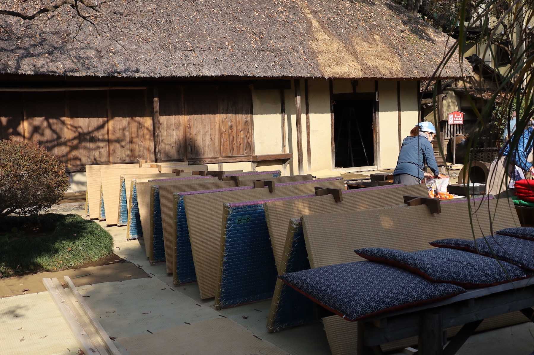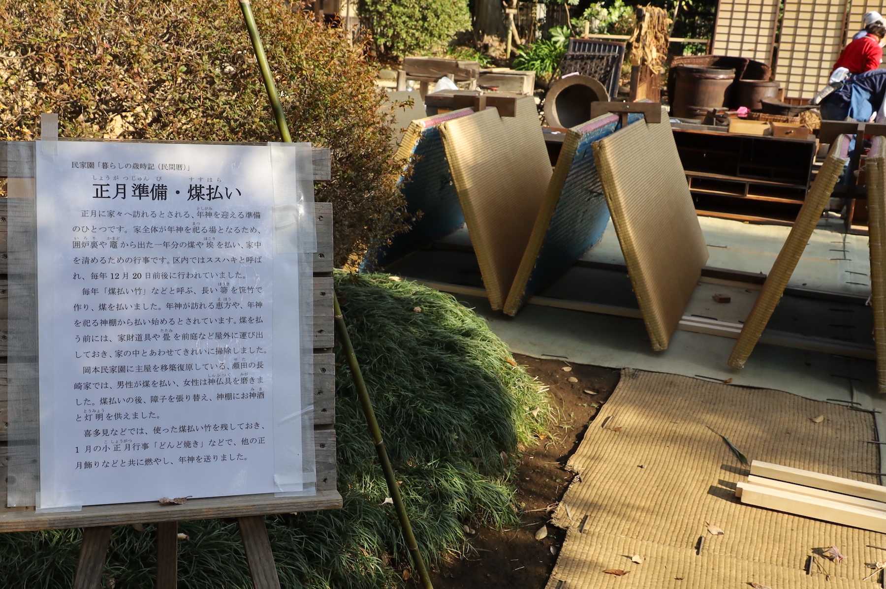この日は「すす払い」を行っていました。正月に年神を迎えるため、正月前に主屋等の煤を、笹や竹で作った箒(ススダケ)を使って払い、家財道具を前庭に出し、拭き掃除をして、家を清めるそうです。