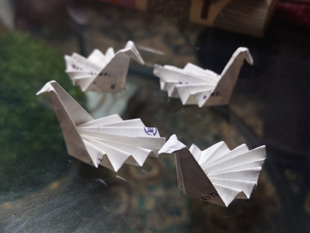早速作ってみたが、これが意外に難しい。苦戦した原因は、ひとえに説明不足だと思う。家族の割りばし袋も借用して、何度か試行錯誤し、ようやくそれなりに形になった。ポイントはギザギザの尾の部分を丁寧に折って両端を重ね合わせることだ。