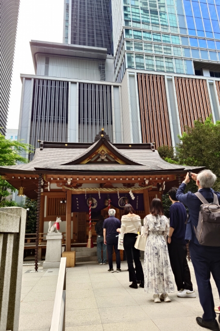 ビルの谷間にヒッソリとたたずむ小さな神社だが、参拝者が後を絶たない。 A small shrine quietly nestled between tall buildings, yet it continues to attract many visitors.