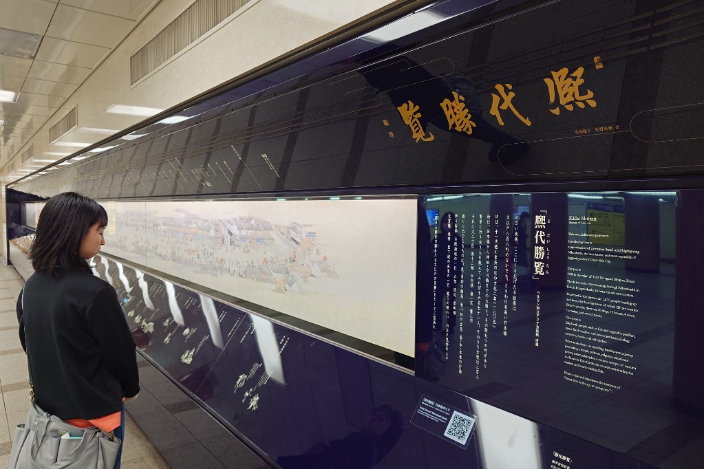 「熈代勝覧」。地下鉄三越前駅のコンコースに設置されている、当時の日本橋界隈を描いた絵巻(複製画)。現物は現在も旧ベルリン東洋美術館、現ベルリン国立アジア美術館が所蔵している。 The "Kidaishoran" (a painted scroll depicting the Nihonbashi area at the time) is displayed in the concourse of the Mitsukoshi-mae subway station. The original is held at the former Berlin Museum of East Asian Art, now the Berlin State Asian Art Museum.