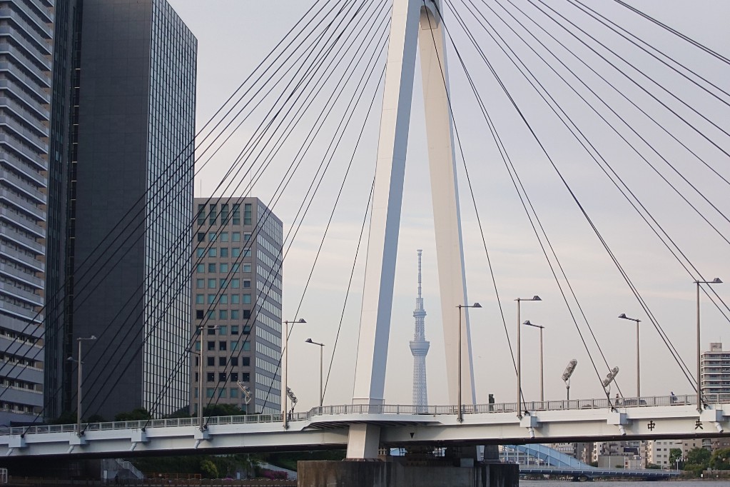 中央大橋の間に東京スカイツリーが入り込むタイミングがシャッターチャンスなのだそうだ。 There’s a perfect photo opportunity when Tokyo Skytree aligns between the spans of the Chuo Ohashi Bridge.