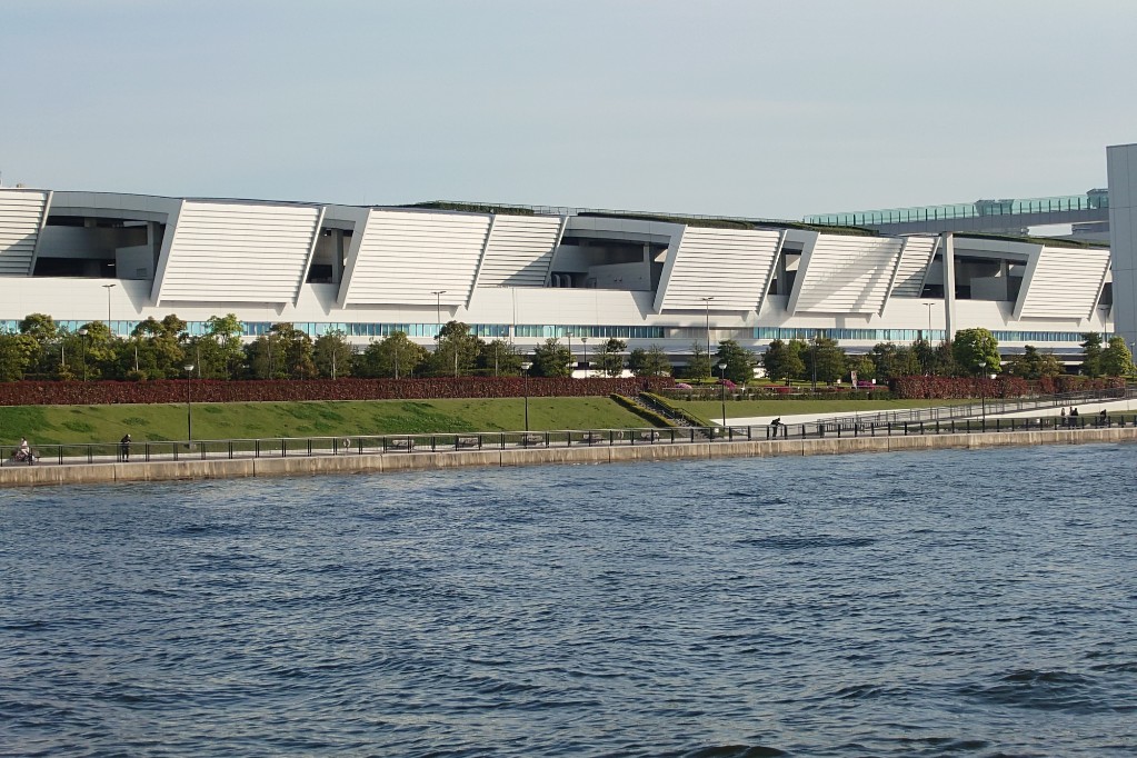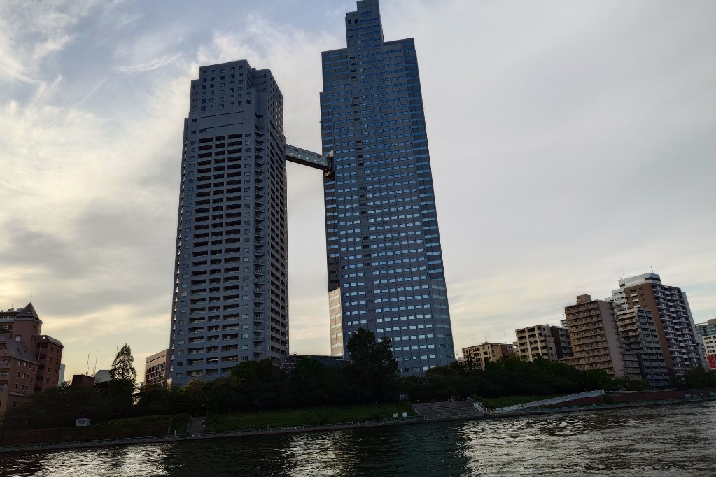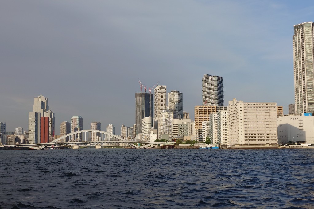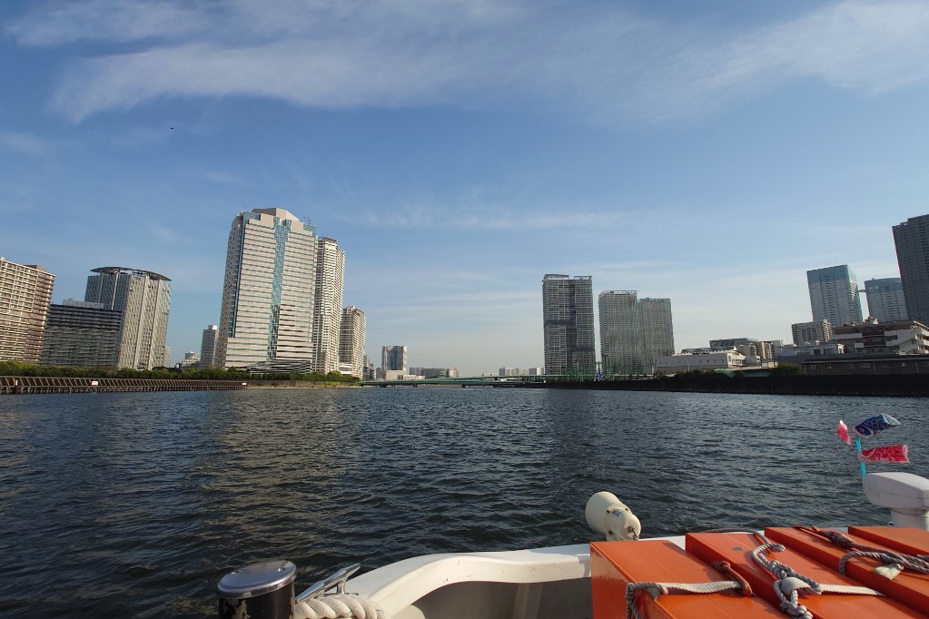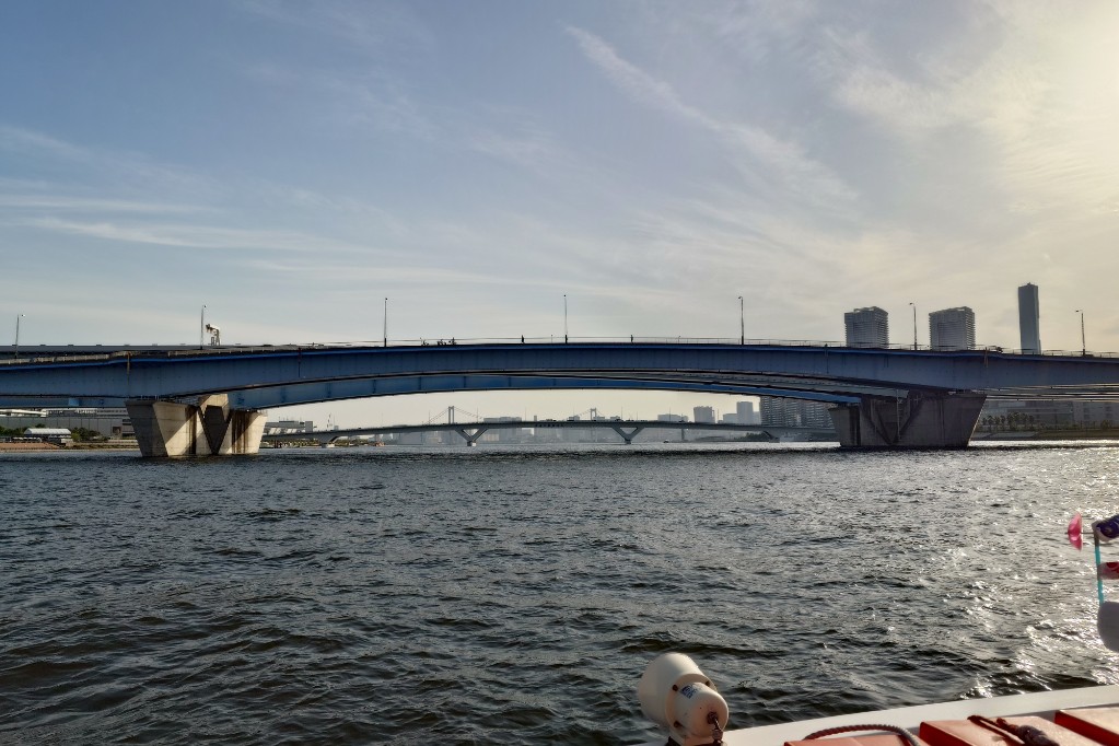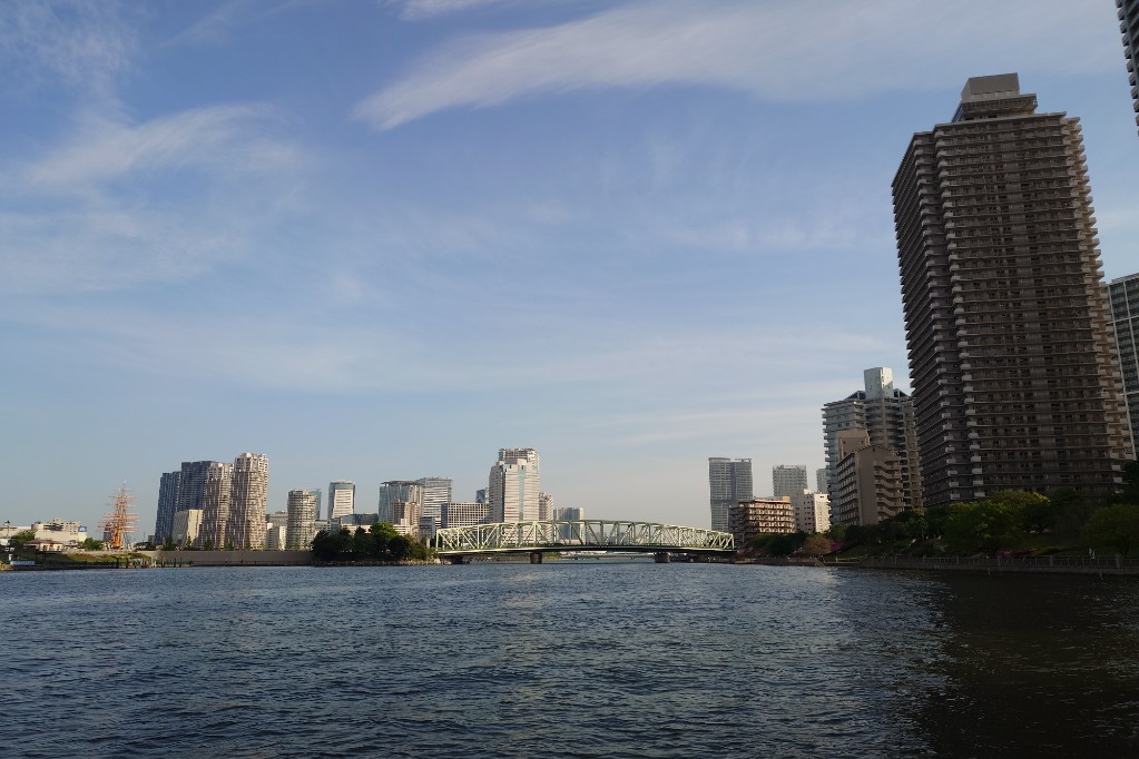 隅田川に合流。一気に川幅が広くなる。このサイズのクルーズ船だと迫力満点だ。 the river merges into the Sumida River, where the river suddenly widens. For a cruise ship of this size, the view is truly impressive.