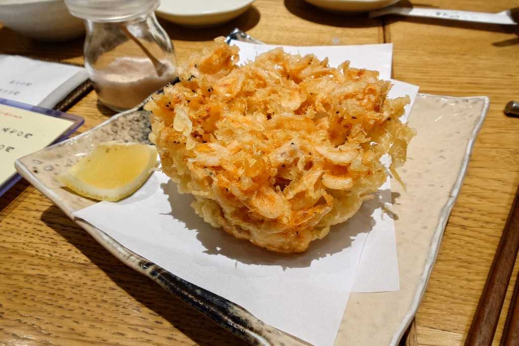 桜エビのかき揚げ。他に何品か注文したが、写真を撮り忘れた。鴨料理が大変美味だった。