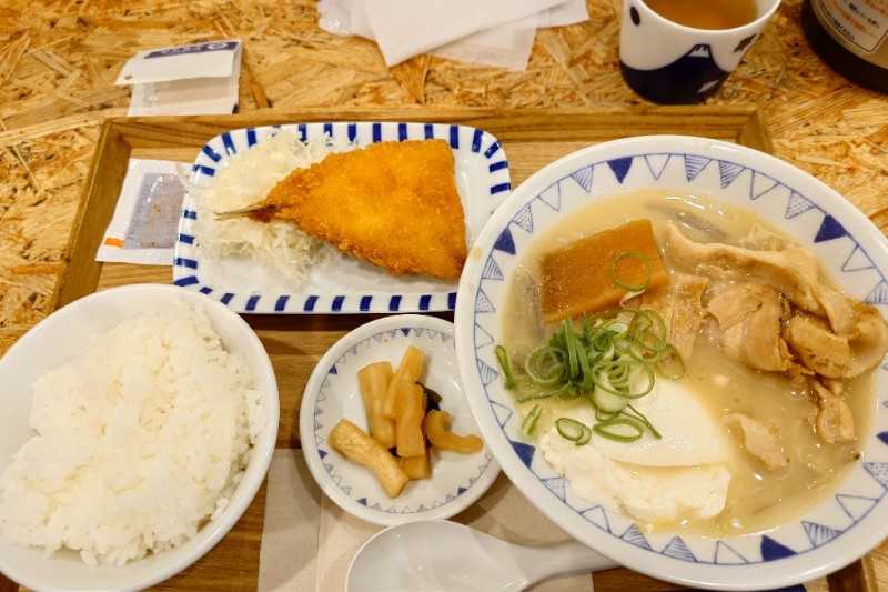 ごち豚渋谷南口店のごち豚定食。麦みそ、味しっかり、ご飯普盛り。アジフライの無料券がついてくる。 I had the Gochi Buta set meal at Gochi Buta Shibuya South Exit. The barley miso was flavorful, and the rice portion was a regular serving. It also came with a free coupon for fried horse mackerel.