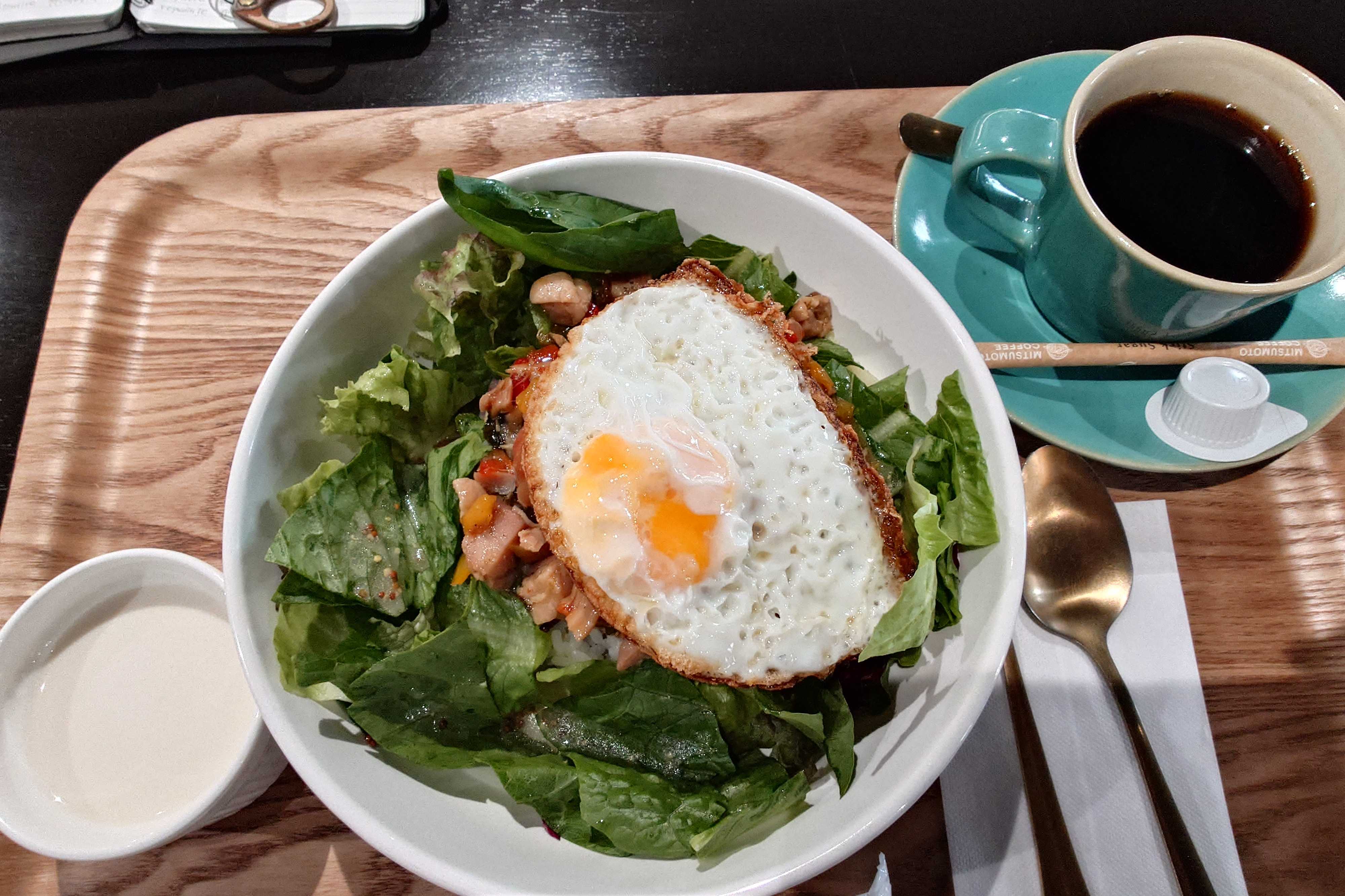 私のお気に入りの店のひとつ、廣瀬與兵衛商店(ひろせよへいしょうてん)の日替わり丼。この月はガパオだった。肉が炭の香りがして香ばしいのと野菜がたっぷり載っているのがいい。 One of my favorite spots, Hirose Yohei Shoten, serves a daily rice bowl special—and this month’s was gapao (Thai basil chicken). What I love about it is the char-grilled aroma of the meat and the generous helping of vegetables on top. It’s both flavorful and satisfying.