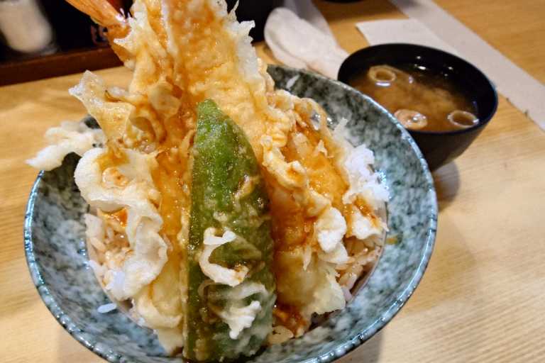 スズラン通りの老舗天ぷら屋「はちまき」の海老天丼。1000円でお釣りがくる。ふだんのランチ時は長蛇の列だが、この日は荒天だったせいか、すぐに入れた。 I stopped by Hachimaki, a long-standing tempura shop on Suzuran Street, and had their shrimp tempura rice bowl (ebi tendon). It cost less than ¥1,000—great value. The place usually has a long line at lunchtime, but thanks to the stormy weather that day, I was able to walk right in.
