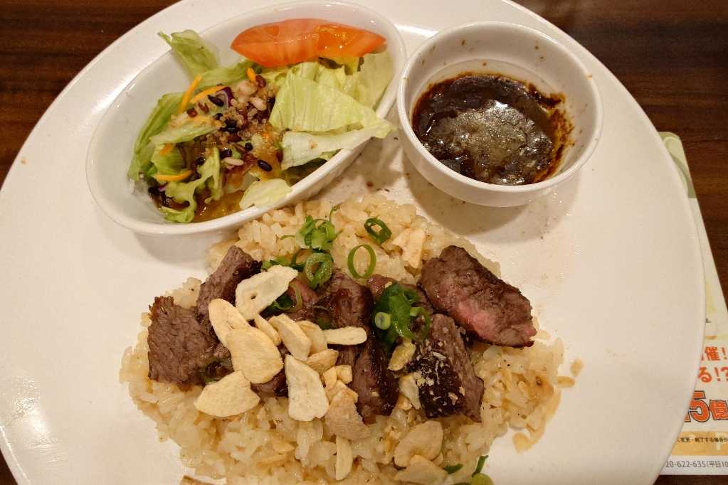 ジョナサンのみすじステーキのガーリックピラフ。ちなみにこれはランチでなく晩飯。
