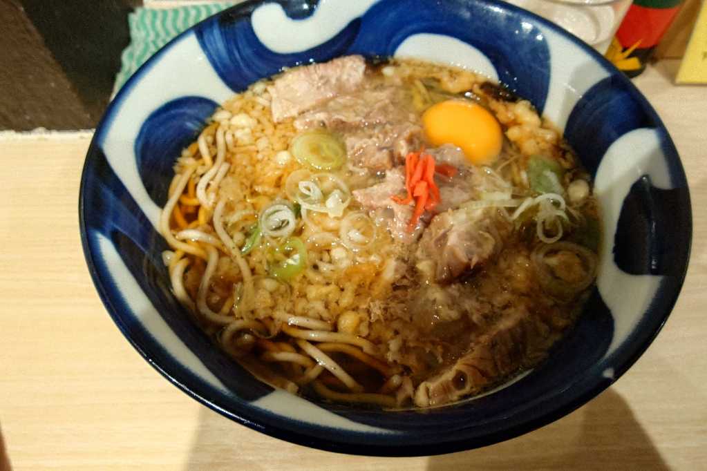 At Ogawamachi, I tried the meat-tama soba at Toyoharu . It’s a rare standing soba shop that focuses mainly on meat soba, and even when I go well outside peak hours, there’s still a line. One word of advice: don’t order tempura soba here.
