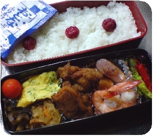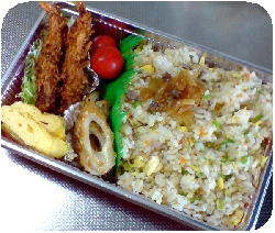 今日のお弁当♪・チャーハン、福神漬け・エビフライ・卵焼き・ちくわのごま油炒め(マヨネーズ和え)・ミニトマト------------------------------------------------------