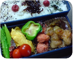今日のお弁当♪・鶏肉と茄子の酸っぱ煮・明太子天・ピーマンのツナマヨチーズ焼き・卵焼き・グリーンアスパラ・ミニトマト-----------------------------------------