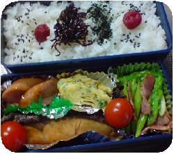 今日のお弁当♪・ベーコンとアスパラ炒め・ねぎ入り卵焼き・ウィンナー・塩鮭・ミニトマト--------------------------------