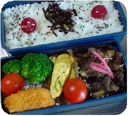 今日のお弁当♪・肉と玉葱の煮込み+紅しょうが・ねぎ入り卵焼き ・白身魚&タルタルソースのフライ(冷食)・ブロッコリ・ミニトマト-------------------------------------------