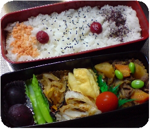 今日のお弁当♪・肉じゃが+枝豆・卵焼き・ちくわのごま油炒め(マヨネーズ和え)・切干大根・グリーンアスパラ・巨峰・ミニトマト----------------------------------