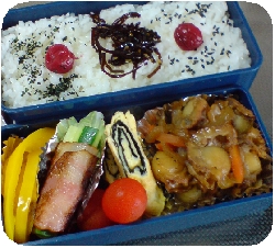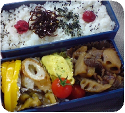 今日のお弁当♪・豚ばら肉とレンコンの煮もの・ねぎ入り卵焼き・ちくわのごま油炒め(マヨネーズ和え)・パプリカ・うりの漬物・ミニトマト---------------------------------------------