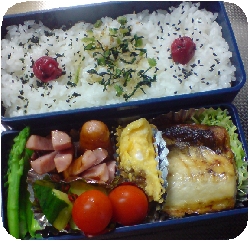 今日のお弁当♪・魚ろっけ(カレー味)・豚味噌ステーキ・ミニオムレツ・ブロッコリ・かぼちゃといんげんの煮物・ミニトマト---------------------------------------------