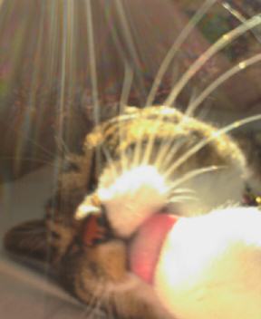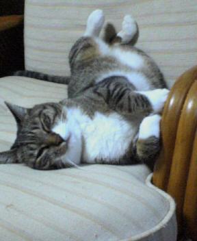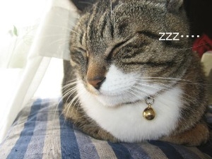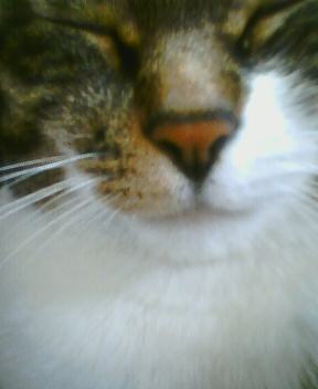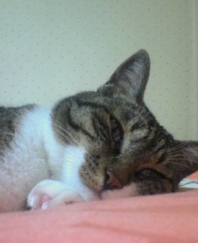 お昼寝中のぷーにゃん。なにやらごにょごにょ寝言中。 ねぇねぇ・・・(ぱんだ) ん?なにかご用ですか? いえ、あのそんな目で見つめられると・・・。遊びましょ♪ 私、お昼寝中なんですけど!!(怒)……失礼いたしました。この後、噛み噛み攻撃を受けてしまいました。つれないなぁ~