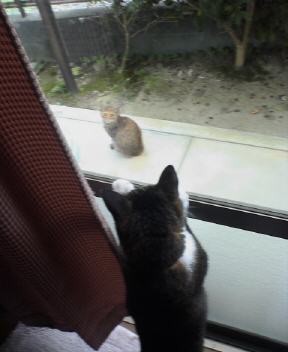 我が家にはかよい猫ちゃんもいます。名前はシャーちゃん。(ぱんだママ命名)由来は簡単♪近づくと「シャー!!!!」と怒るのです。本当はぷーのお友達になって、家族になってほしいけど、触らせてくれません(T_T)それでも、以前は窓を開けると「シャー」と威嚇しながら遠くに逃げて行っていたのが、今はとりあえず「シャー」とは言いますが、そう遠くには逃げなくなりました。慣れてきたかな??朝は閉めた雨戸の外から、「はよメシくれ~!!」と催促してくれるようになりました(*^。^*)v雨戸開けたら逃げるけど(~_~;)とりあえず無理して抱っこしようとしてご飯を貰いに来なくなったら心配なので、様子を見て我が家に迎えられたらいいな~ぐらいの感じで気長に行く事にしました。しかし、問題がもうひとつ。ぷーとの関係です。窓越しにケンカしてます。ぷーもシャーちゃんの事が気になってしょうがないみたい(~_~)近くに人がいると強がってケンカ吹っ掛けるけど、誰も居ないと、そーっと窓に近寄ってシャーちゃんが来るの待ってるみたい。これは心配要らないかな??そうだといいなぁ~ 何してんの~??写真はシャーちゃんが今よりちょっと小さい時。今は結構大きくなってます。窓開けると写真撮れませんが(~_~;)