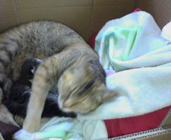 お外のシャーちゃん改め我が家のシャーちゃんずいぶん、家猫生活にもなれてきました。ただし、甘えてくる時も、しっかり警戒してますが…。ちょっとシャーちゃんが隠しちゃいましたが、初めてちびたちの写真を撮ることができました。シャーちゃんの顔がブレブレですが・・・。黒ちゃんとグレーで白くつしたちゃんです。わかんないですね昨日目が開いたのを確認しましたすくすく育ってくれるといいなあ~