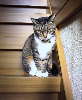 ぱんだ「ぷーにゃん、今日はお姉ちゃんお出かけだから」ぷー「いやだ~つれてけ~」ぱんだ「車で行くけどいいわけ??」ぷーは車が大嫌い。車に乗る=病院に行くなんでしょうね(~_~)ぷー「・・・一人で行きやがれ!」・・・と言うわけでジグレた(ふてくされた)ぷーにゃん階段でお見送りです。ちょっとちょっと、目つき悪いよ!!そんな風に見つめられると行けなくなっちゃうなぁ~
