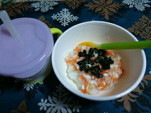 我が家の息子は、9か月になりました。 離乳食は、お粥を6倍粥くらいにして水分を少なくしてみましたが、 かえって好んで食べるようになりました。 量も、ごはん75グラム、野菜類20グラム、タンパク質も15グラム程度に、順調に増えています。 9か月になると、なるべく歯茎でよくかんで食べてもらうようにしなければなりませんが、 かむ回数が少ないように思うので、食べさせるペースをゆっくりめにして、 モグモグするように声をかけています。 野菜の切り方も、少し大きめにしましたが、支障なく食べています この間のごはんは、大根とにんじんと、鯛(正月に食べた刺身をフリージングしておきました)をだしで煮ました。 おいしいと、ニコリとして足をバタバタします。 そのような反応が多くなり、作る方も嬉しいです