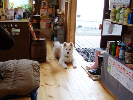 先週は更新をさぼってしまいました…。海で泳いでいる動画をアップしたかったんだけど、いまいち上手くいかず…。 さて、今週は、土曜日に閉店したあと、阿蘇の黒岳にある男池というところにいってきました。といっても、閉店後に出発したので、男池についたのは夜中の2時すぎ。途中、販売機が沢山ある場所で車を停めて仮眠していると職務質問される、という出来事もあったりして(自販機荒しのパトロールみたい)なんとか辿りつきました。有名な名水らしく、その水でラーメンを作ったら美味しいのでは!?ということで、途中で買い込んだカップラーメンを朝、頂きました。味は……うーん、美味しいような気がする!外を見たいさんごちゃんと、さんごちゃんが飛び出さないようにカラーを掴む私。 そして、開けて日曜日は大分の筋湯温泉に寄ってきました。日本一の打たせ湯という共同浴場に入りました。300円でメダルを買って、開店ドア(?)を押して入るシステム。建物自体、なかなか赴きがあっていい温泉でした☆ そして、その打たせ湯の向かいにある売店のお姉さんが「あら、その犬お宅の犬? そこのエンジェルちゃんにそっくりだわー」…と。 エンジェルちゃん。サモエドオーナー界では有名らしい(?)温泉旅館の看板犬です!私も以前CMで見たことがありました。http://www.sujiyu.co.jp/ 私が打たせ湯に打たれている間、店主1号はそエンジェルちゃんに会い行ってました。泣き声だけを頼りになんとかその旅館に私もたどり着き…記念撮影! エンジェルちゃんは、一代目と、エンジェルジュニアがいるらしく、一代目の元祖エンジェルちゃんは高齢のため腰が弱く、最近は横になっていることが多いそうです。今日も、玄関先で扇風機をあててもらって涼んでました☆ジュニアちゃんは1歳5ヶ月。大きさは智くんよりもさらに大きく感じました。 鼻が黒々としてて可愛いな~ 写真で見るとそんなに大きく感じないけど、実際見ると大きい!