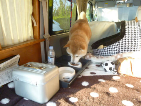 バイキングの朝食今日は旅行記に戻ります。2日めの朝からです。朝散歩のためゴンがいる車に行き覗くと、ちゃんとドームベッドに寝ていました。ドアを開けると起きてきました。ゴン、おはよう。お宿周辺の芝生のところをひとまわりしてから、その隣にある高台の公園に行きました。お宿と朝日をバックに。オシッコをして芝生を蹴り蹴り。この公園からの景色。海が見えます。朝散歩のあとは朝食です。このようにお料理が並んでいました。サラダコーナー。お茶漬けコーナー。 煮つけにすき焼き。 干物に温泉卵。 お蕎麦にご飯のお供。 ビーフシチューもありました。だし巻き卵はその場で焼き立てです。 こんな感じで取りました。干物にビーフシチュー。その他いろいろ。次はデザート。クロワッサンにミルクケーキ。 フルーツにドリンク。 こんな感じで取りました。クロワッサンがサクサクで美味しかったです。旅行記は今日はここまで。昨日は1日本降りの雨でした。3回のお散歩ともにびしょ濡れになったゴンです。今日は気持ちよく晴れて、ゆっくりお散歩できました。ではまた