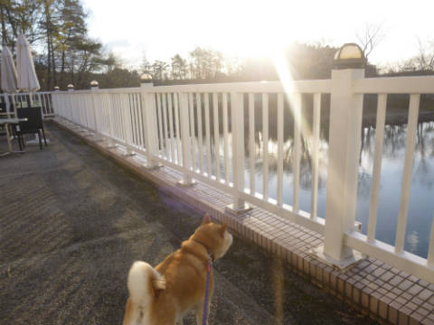 朝のご様子旅行記の続きです。旅行6日目の朝です。朝散歩に出発。散歩道という案内板があったので、そちらの方に行ってみました。階段を下りて、木板の道を歩きます。ちょうどテラス棟の裏側です。ドッグランに行った時は池を左回りで行ったのですが、今回の散歩道は池を右回りで歩きます。この階段を登ると、テニスコートに到着しました。そのテニスコートの奥にドッグランがあります。ということで、せっかくドッグランに来たので中に入りました。ドッグランの中をウロウロ。クンクンウロウロを繰り返していました。そこへ、ランちゃんがやってきました。ランちゃんおはよう~。金網越しでしたが、上手にご挨拶していました。大丈夫だと思ったのか、ランちゃんのお父さん、ドッグランの中に入ってきました。確かに大丈夫そうだったんだけど、やっぱりリードを離すのはちょっと心配。リードを付けたまま少し遊ばせて、私たちはドッグランの外に出ました。その後はドッグラン周辺をお散歩させて部屋に戻ります。朝散歩の後は朝食です。その朝食は明日にしますね。ではまた