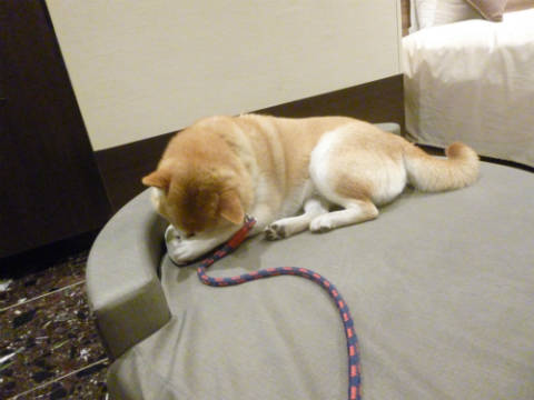 まったりタイム旅行記の続きです。今日はエピナール那須のお部屋での様子を。お部屋にはワンコ用のソファーが置かれています。可愛いソファーですね。でもゴンは最初のうちはここへ座ろうとはしません。おうちではソファー禁止なのでそのつもりでいるのかも。テーブルの下にもぐったり、お父さんに甘えっこしたり、お部屋の中を自由にしていました。でもふと見ると、ゴンがソファーに。ソファーに乗っても叱られないのが分かったのか、その後はずっとソファーでおくつろぎでした。このソファーいいですね。ゴンのサイズにピッタリ。その後はソファーでぐっすりお休みでした。この時期はまだ朝晩は寒いくらいで、高原ということもあって、夜は冷えました。でもここは床暖房までついているんです。床暖房のあるホテルって珍しいですよね。エアコンの暖房と床暖房、ダブルでつけてヌクヌク。ゴンもグッスリでした。そろそろご就寝です。お休みなさい。夜中に目が覚めてゴンを見たら、こんな格好で寝ていました。写真を撮っていたら起こしちゃった。寝心地のいいソファーでゴンもグッスリ寝られたようです。話は前後しますが、エピナール那須に到着してすぐに、部屋に案内してくれたスタッフさんが記念撮影をしてくれました。こちらの写真です。こんな風に加工して、滞在中テラス棟のロビーに飾られました。帰りにお土産としていただきました。今は自宅の玄関に飾っています。私が写っていないって?実は私、この日花粉症を発症してしまって、鼻はグスグス、目は真っ赤、一生残るような記念写真を撮れる顔ではなくて遠慮しました。ちょうど花粉がピークに散っている時期だったんですよね~。ちょっと残念でした。今日はここまで。ではまた